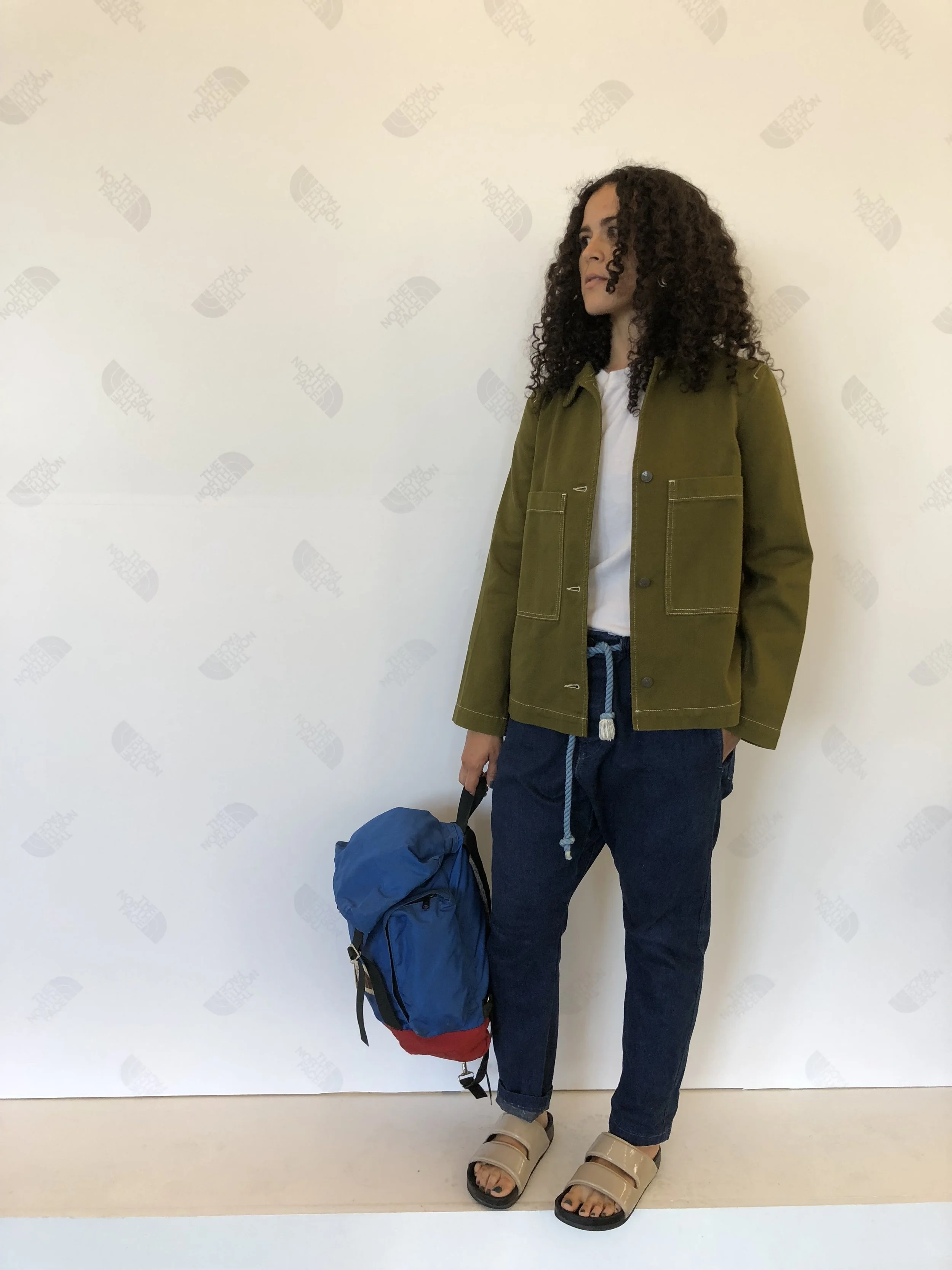 1x1 Folded pants [image 2] are uniquely sourced oversized trousers that are then folded into deep pleats and tailored. Industrial Designer and Photographer, Daniel Villarreal’s are chocolate brown Dickies. He brought life long friend and muse, Vera Claeys, to his final fitting.Vera now has olive twill and ivory silk folded pants. Through sourcing, fittings and complimentary pressings a friendship and creative collaboration formed.